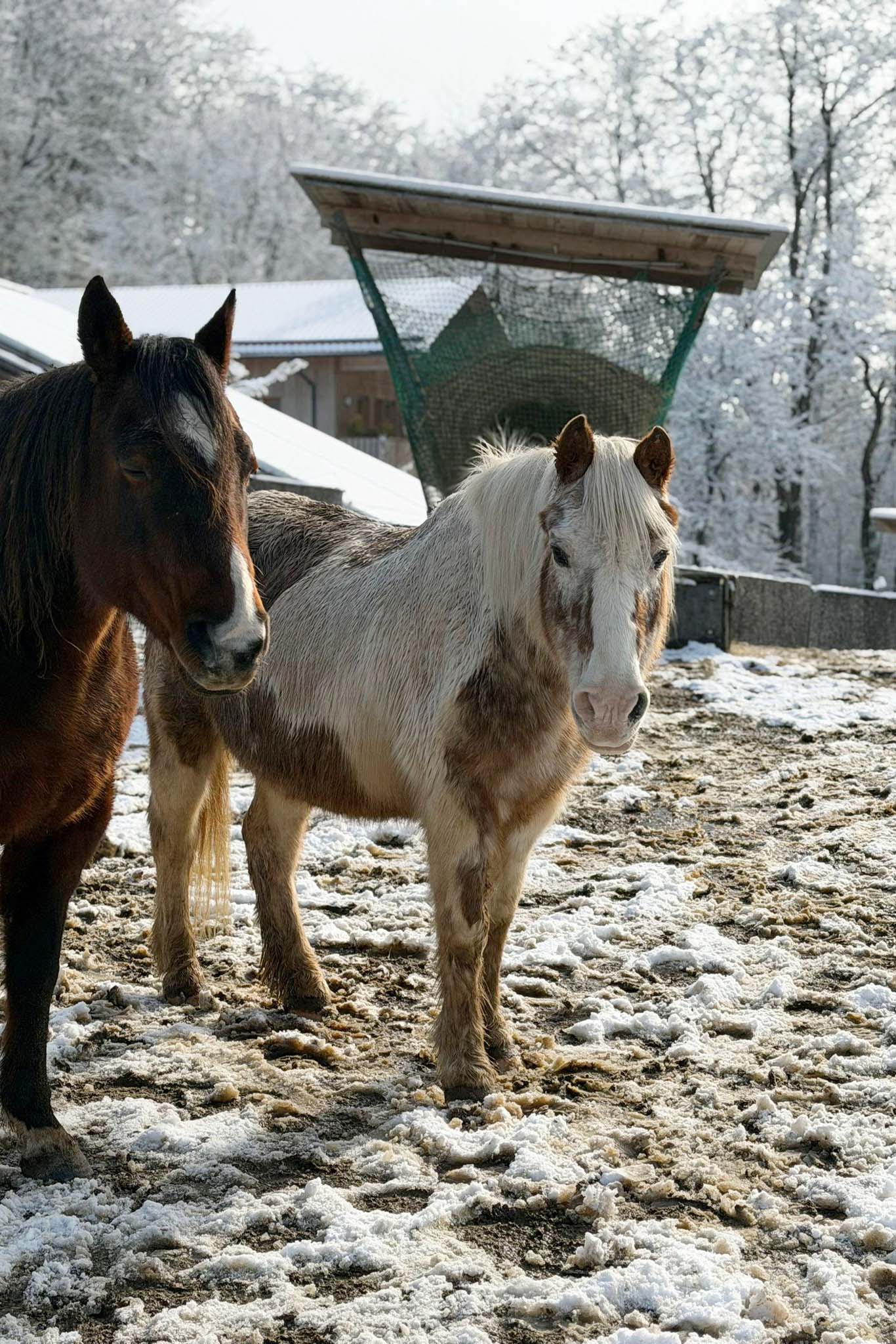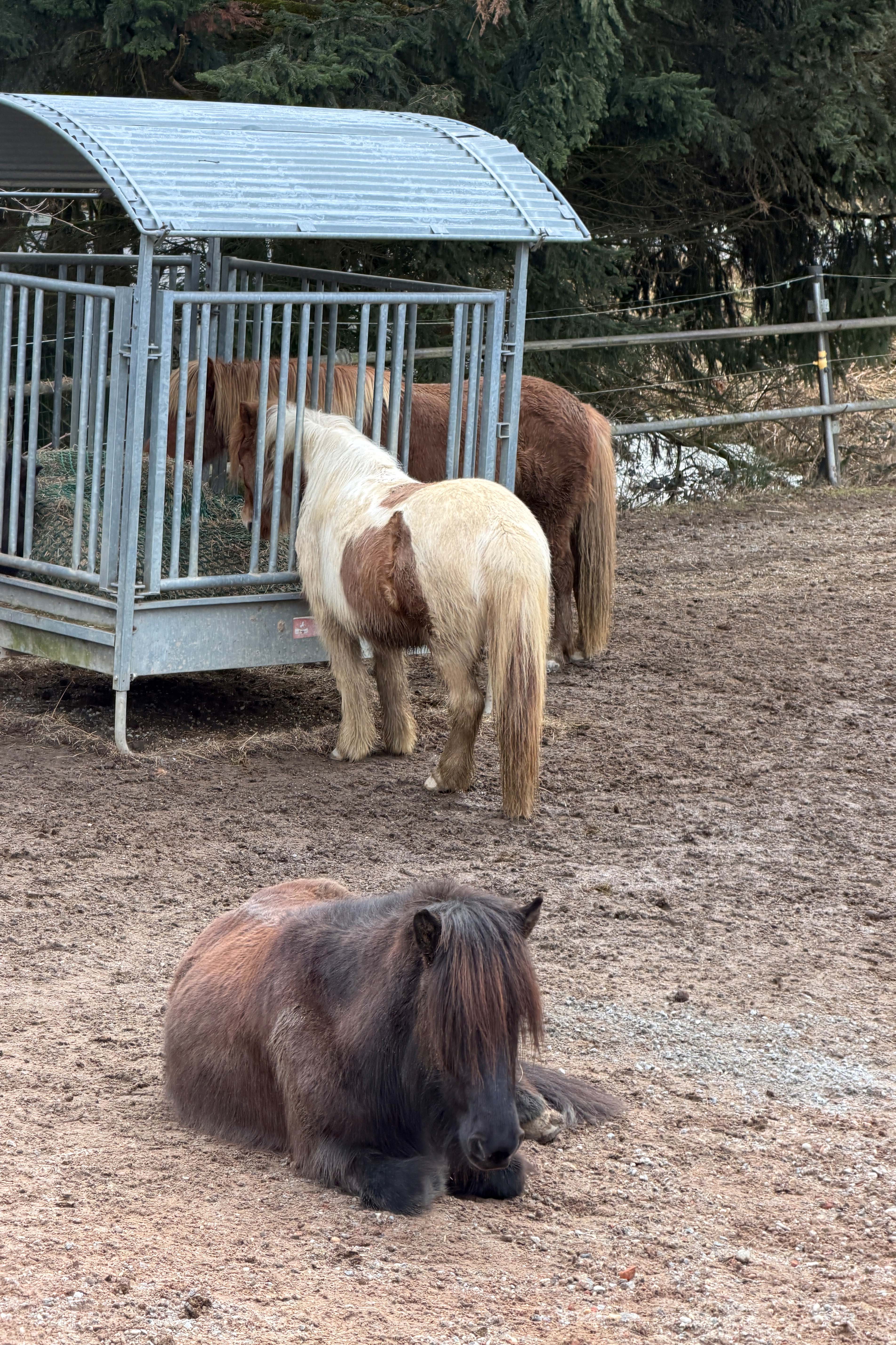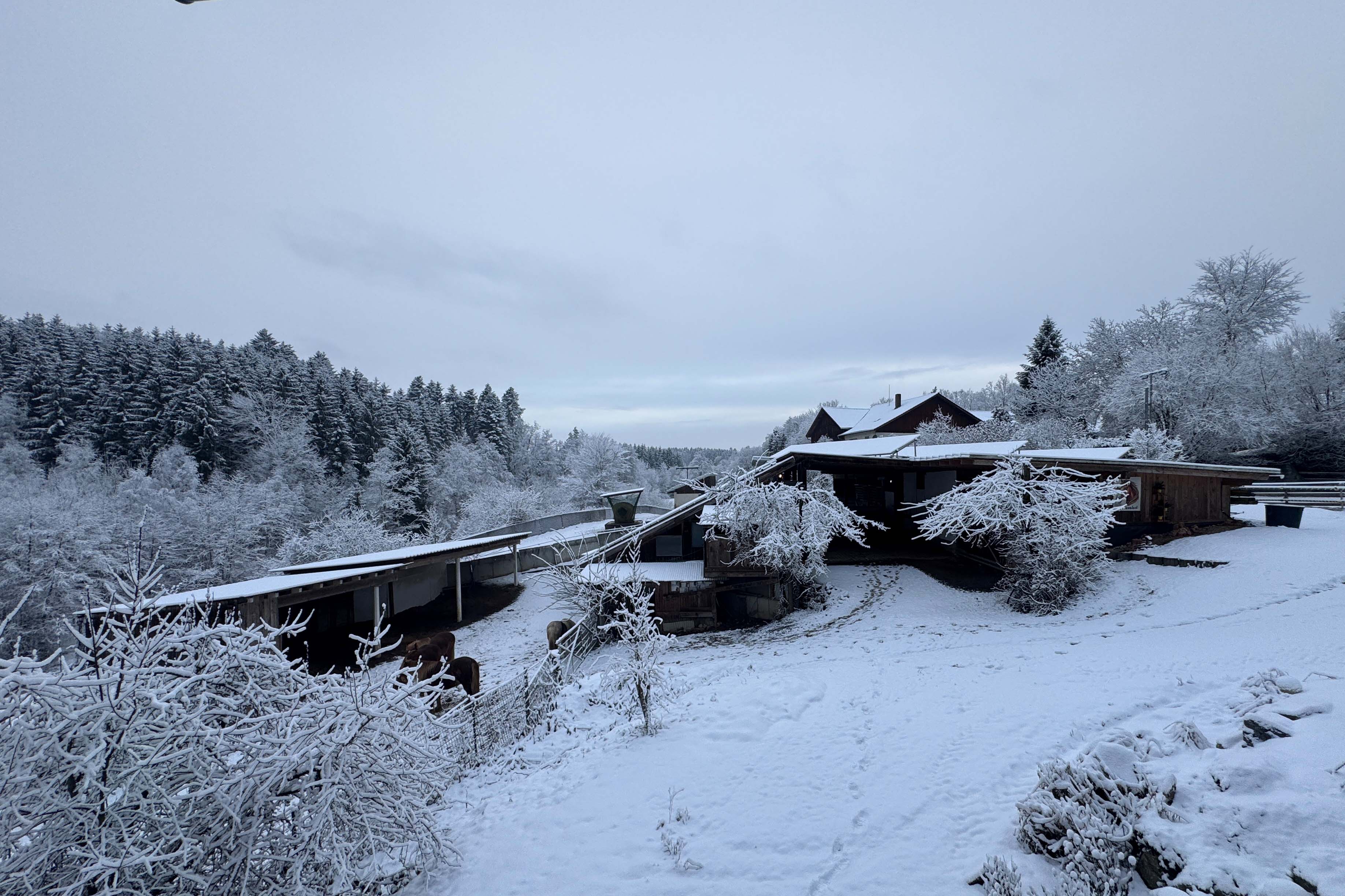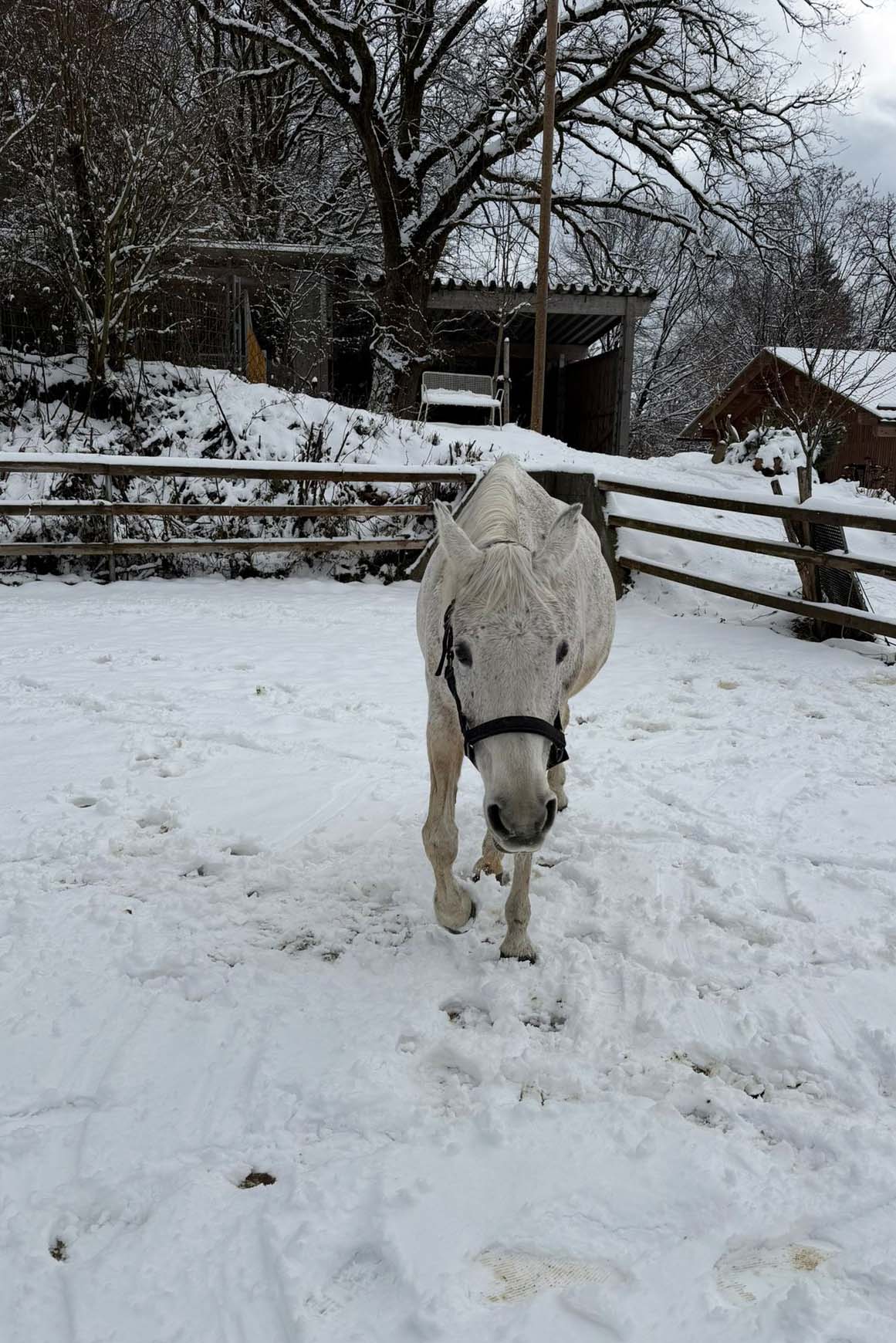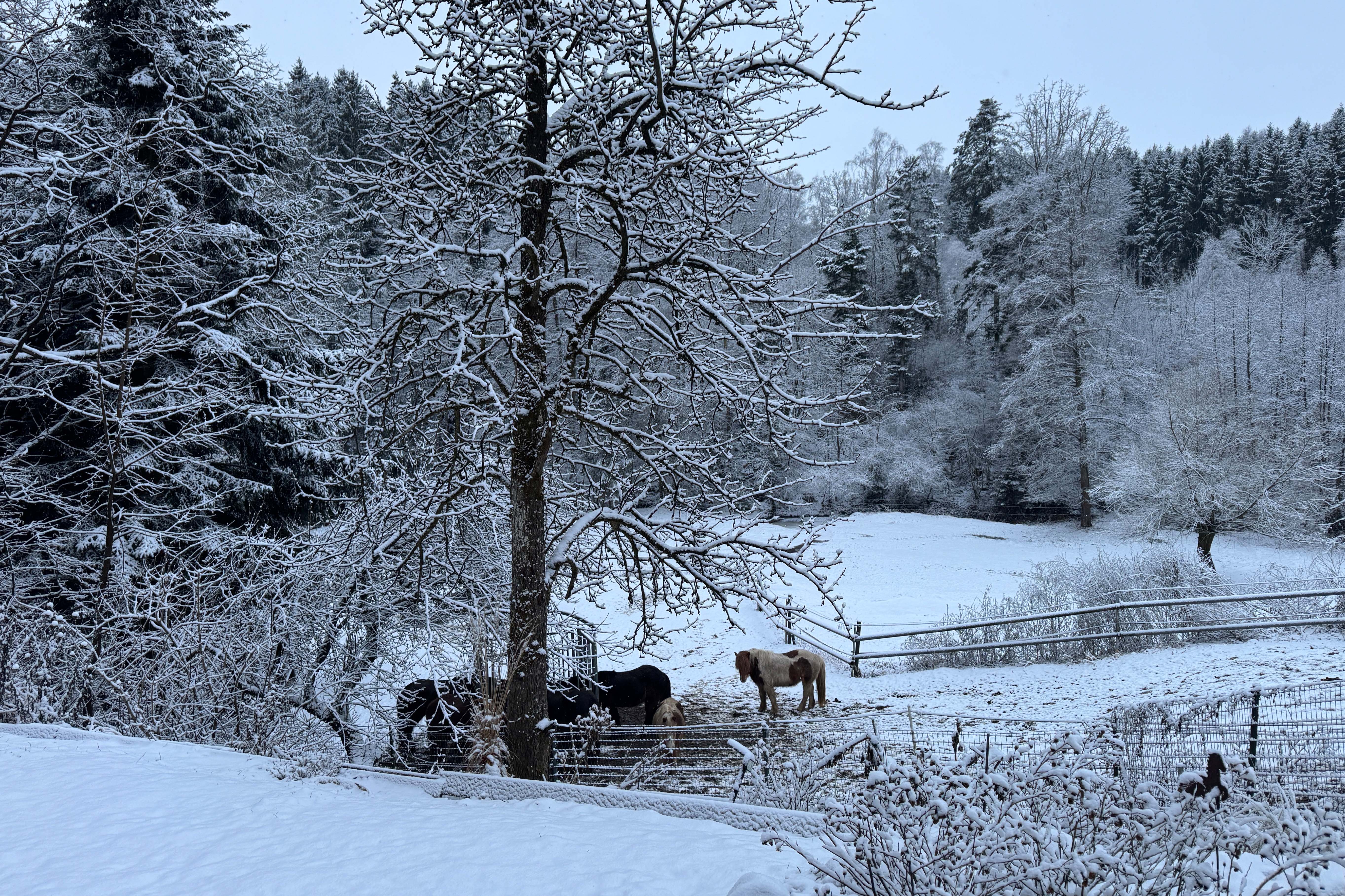 Der Winter hielt uns fest im Griff, wobei wir uns flexibel auf wärmere und kältere Temperaturen einstellen mussten. Der Schnee war schon großflächig geschmolzen, samt der Eisplatten, da fing es wieder an zu schneien. Für kurze Zeit zauberte die Sonne ein “Winterwonderland”! Levin baute aus dem reichlich vorhandenen Schnee einen freundlichen Drachen (siehe oben). Und in der Heuherde begrüßten wir Sakura und Cimbi (siehe Teil 2). Gegen Ende Februar wurde es mit “Dauerregen” so richtig ungemütlich.