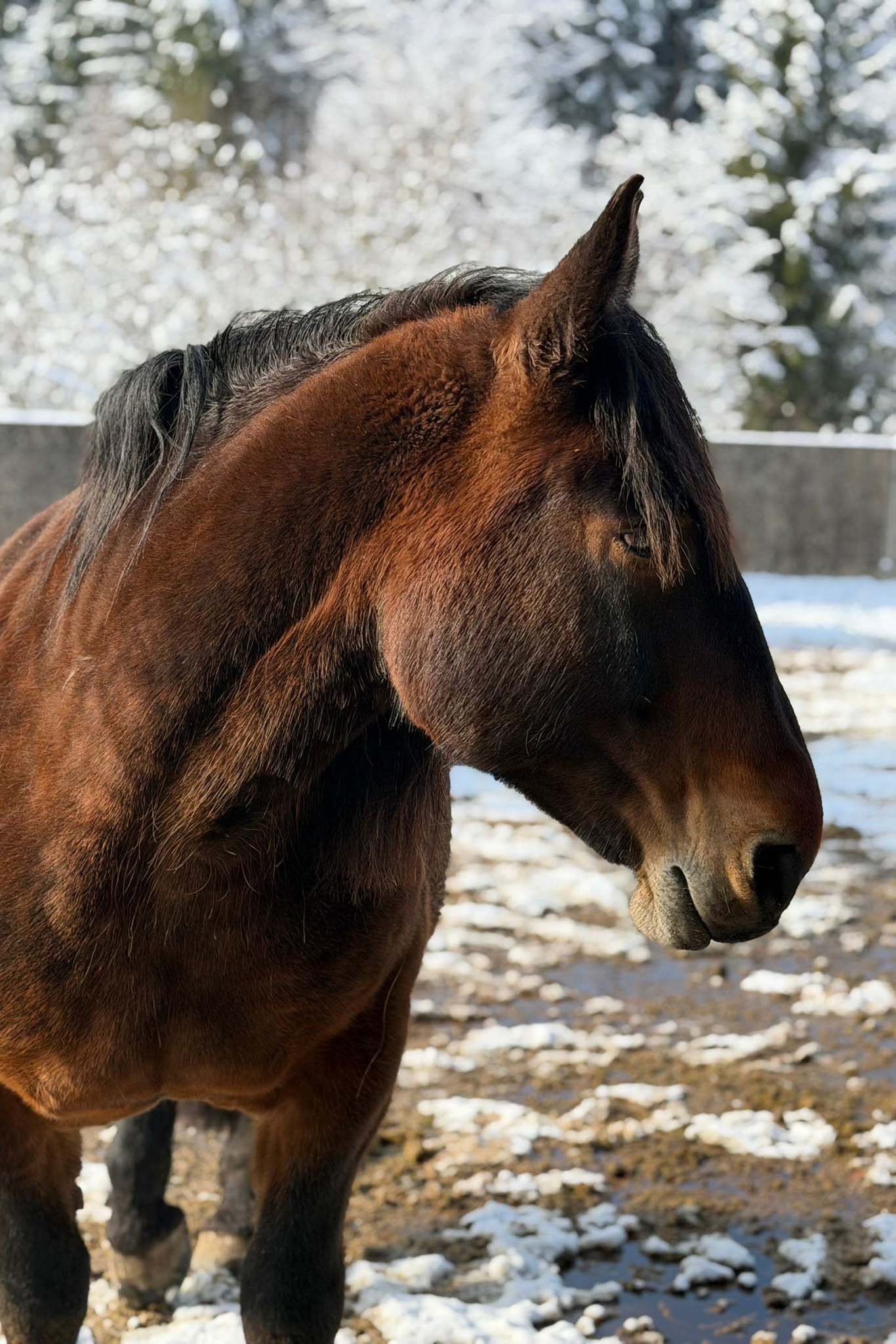 Der Winter hielt uns fest im Griff, wobei wir uns flexibel auf wärmere und kältere Temperaturen einstellen mussten. Der Schnee war schon großflächig geschmolzen, samt der Eisplatten, da fing es wieder an zu schneien. Für kurze Zeit zauberte die Sonne ein “Winterwonderland”! Levin baute aus dem reichlich vorhandenen Schnee einen freundlichen Drachen (siehe oben). Und in der Heuherde begrüßten wir Sakura und Cimbi (siehe Teil 2). Gegen Ende Februar wurde es mit “Dauerregen” so richtig ungemütlich.